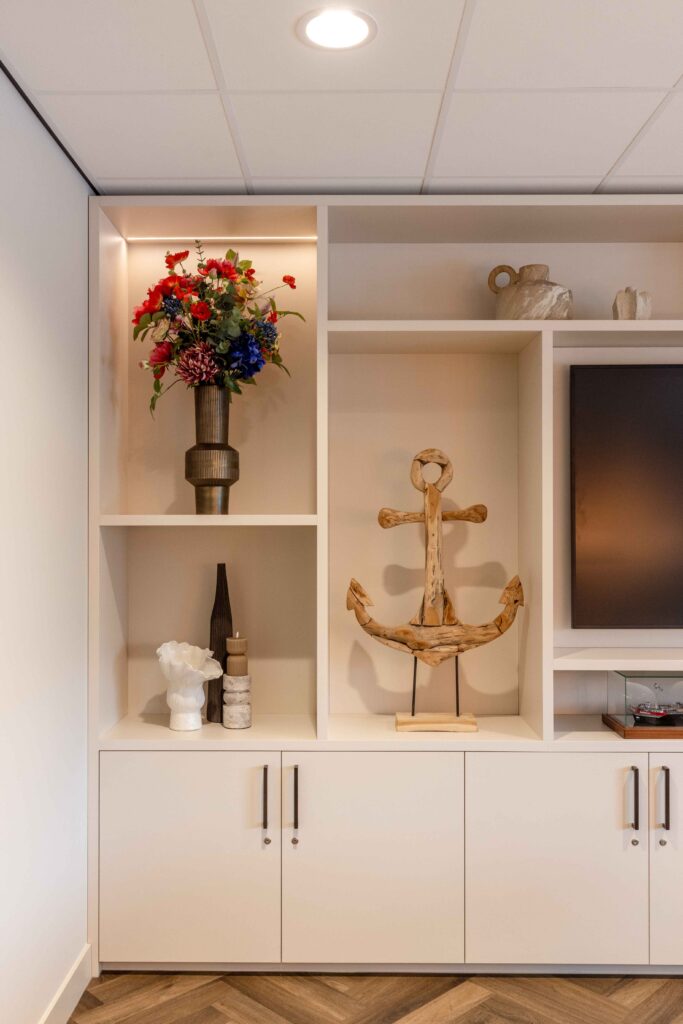 Denk aan (sfeer)verlichting, accessoires, kunst of planten. Hierbij kijken we altijd echt naar elementen die het ontwerp aanvullen en niet drukker maken. Zodat het geheel echt af voelt.