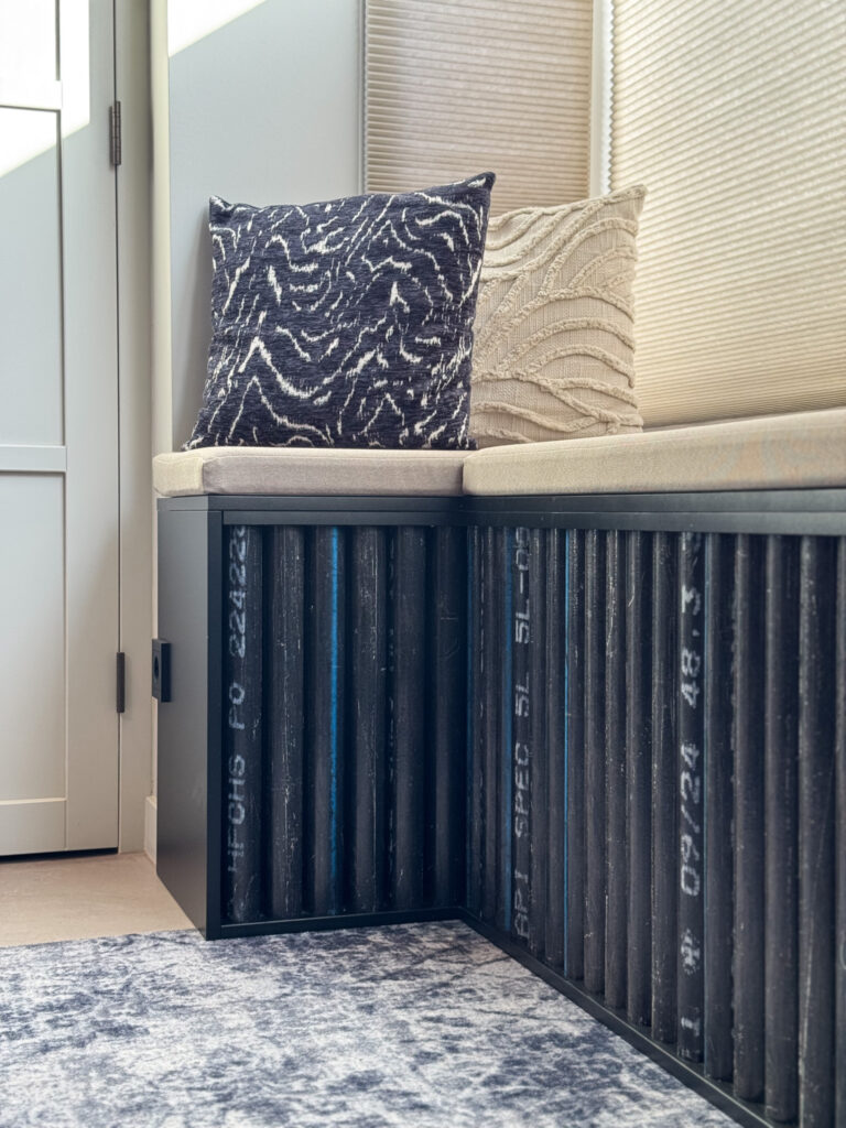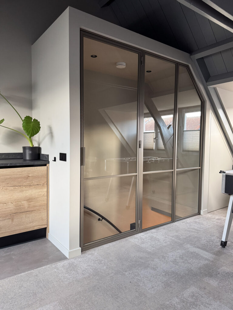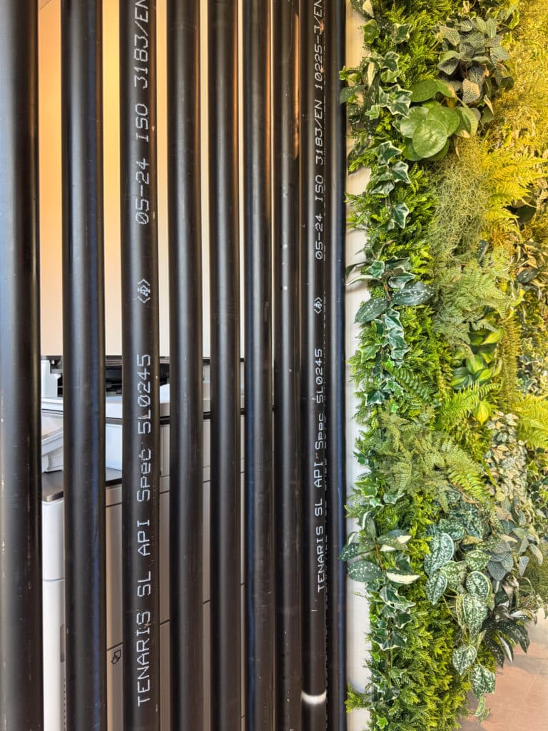 Bumaco produceert buizen, dat materiaal hebben we subtiel laten terugkomen in het ontwerp. Zo is de scheidingswand bij de kopieerruimte opgebouwd uit stalen buizen, en bij de erker aan de voorzijde is een maatwerkbank afgewerkt met hetzelfde materiaal. Zo krijgt het interieur een herkenbaare, eigen uitstraling.