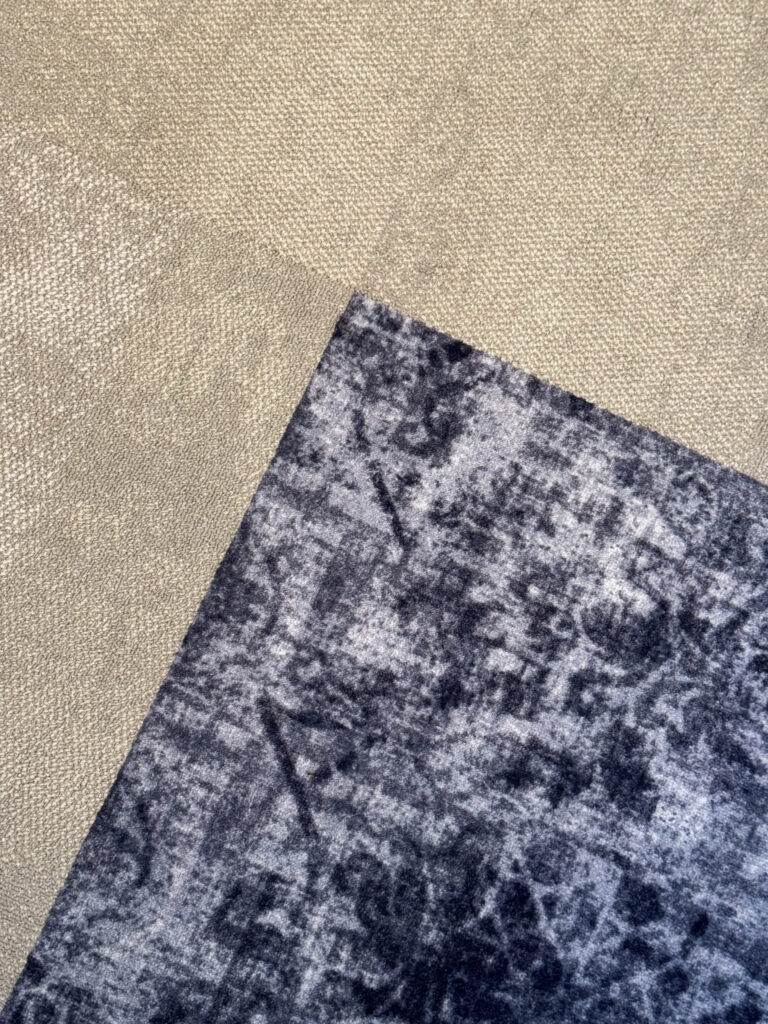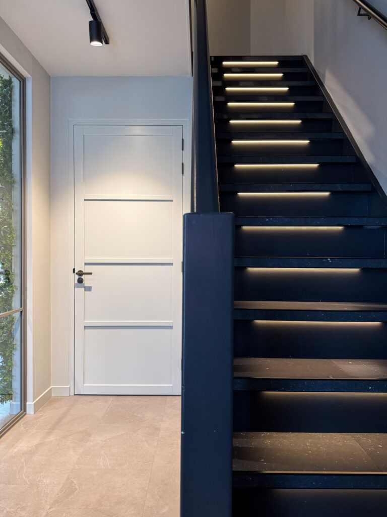 De vloer is uitgevoerd in betonlook pvc, gecombineerd met tapijt voor extra warmte en akoestiek. De trappen zijn voorzien van pvc met geïntegreerde verlichting, en zelfs de toiletten zijn in dezelfde kleuren doorgetrokken voor eenheid in het geheel. De stalen deuren kregen een warme grijstint, waardoor ze perfect aansluiten bij de rest van het interieur.