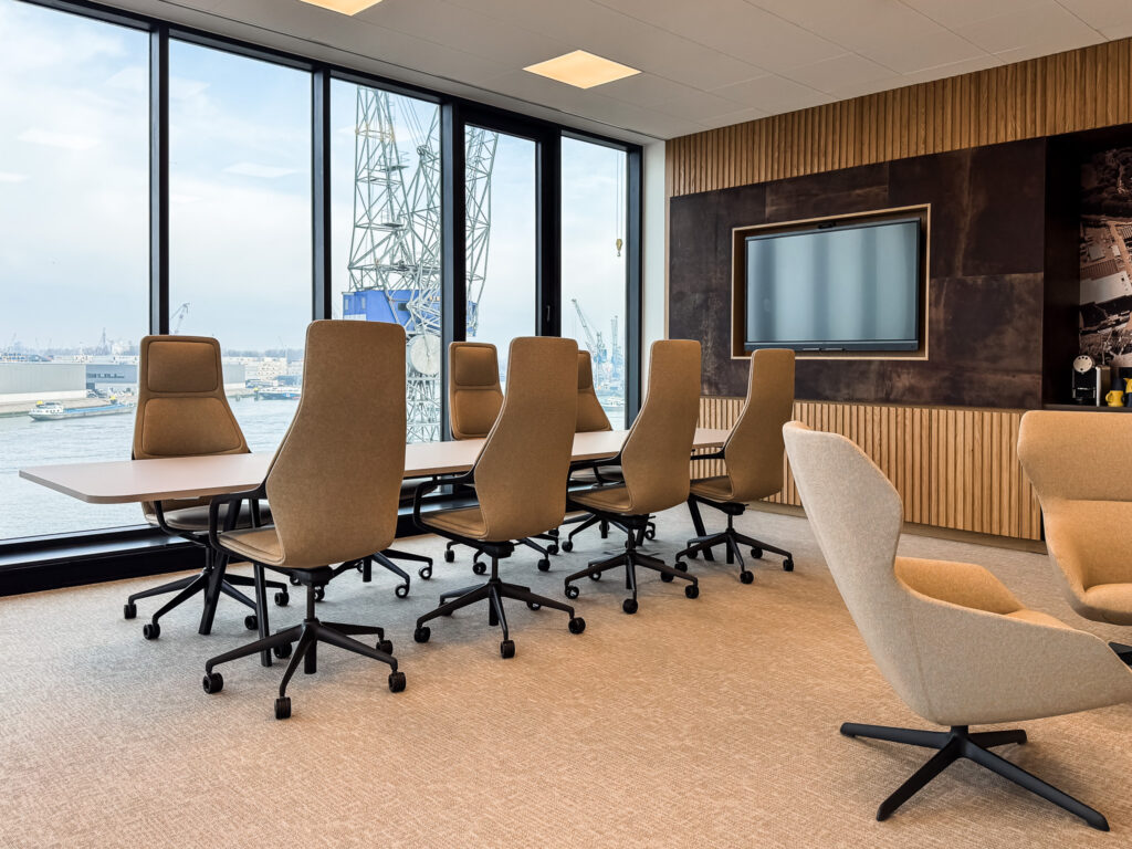 De kantoormeubels sluiten naadloos aan op het ontwerp: van bureaus en vergadertafels tot stoelen en banken.